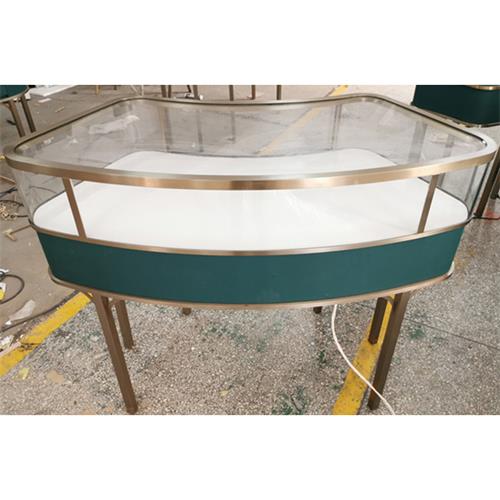 对于这种弧形珠宝展示柜,在定制过程中应注意热弯玻璃与不锈钢之间的接合缝隙。尺寸越小,缝隙越小,误差越小,效果越好,因此手工效果好,质量强