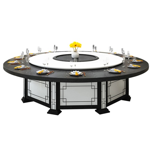 酒店新中式自动旋转15人20人大圆桌电动餐桌采用的是经典黑白颜色的搭配,以传统的窗花花格作为设计元素,体现中国传统文化的传承,